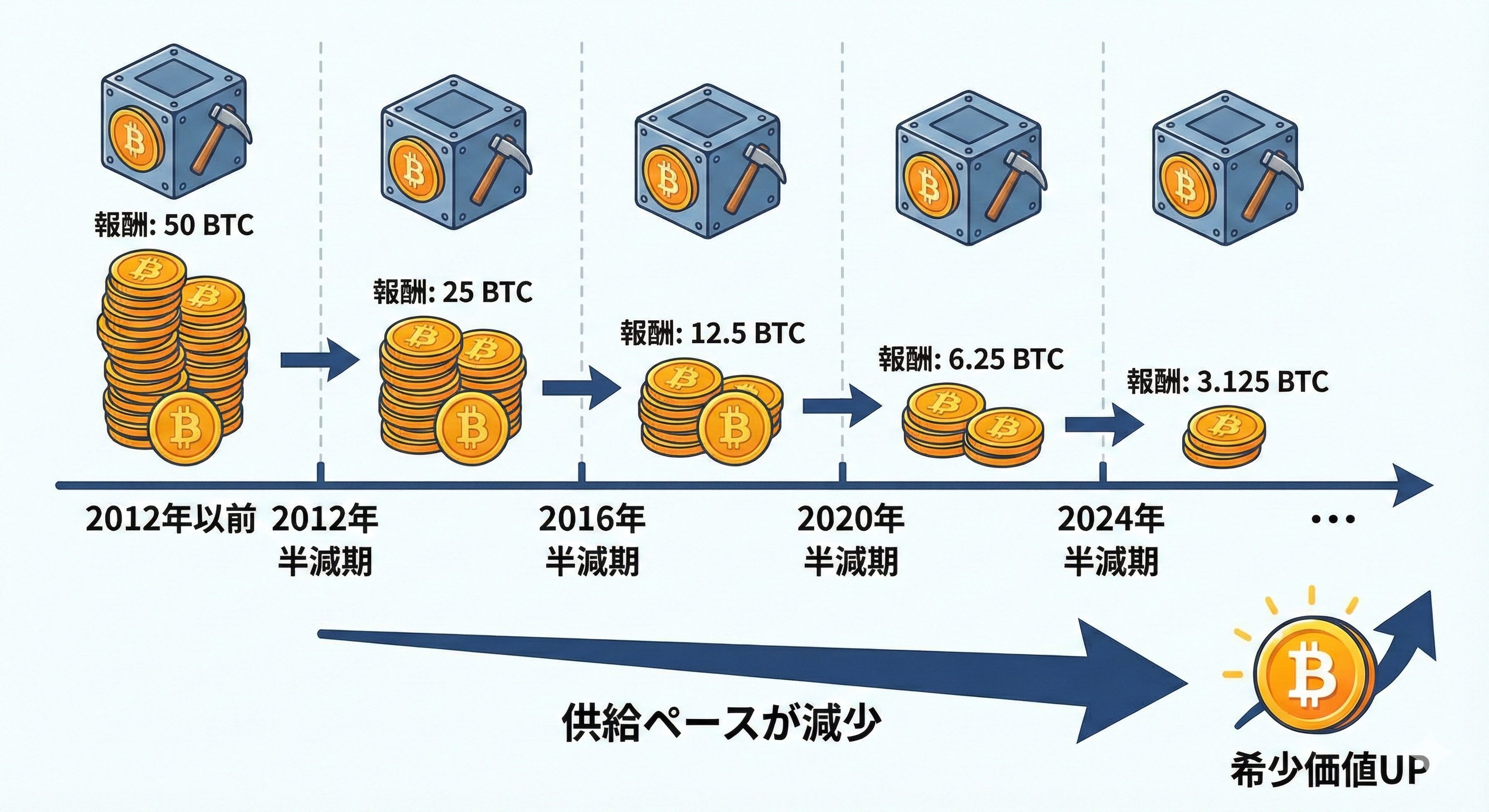 | 2回目 | 2016年7月 | 25 → 12.5 BTC | 2017年の仮想通貨バブル(「億り人」続出)へ繋がった |